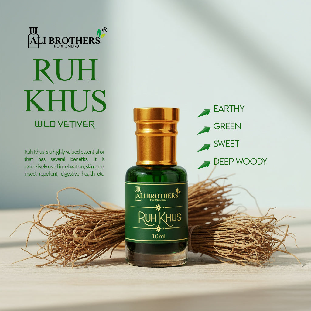 It is produced by deg and Bhapka process. Ruh Khus is known as "Oil of Tranquility" it is earthy, green, sweet, deep woody note. It is a highly valued essential oil that has several benefits. It is extensively used in relaxation, skin care, insect repellent, digestive health etc.